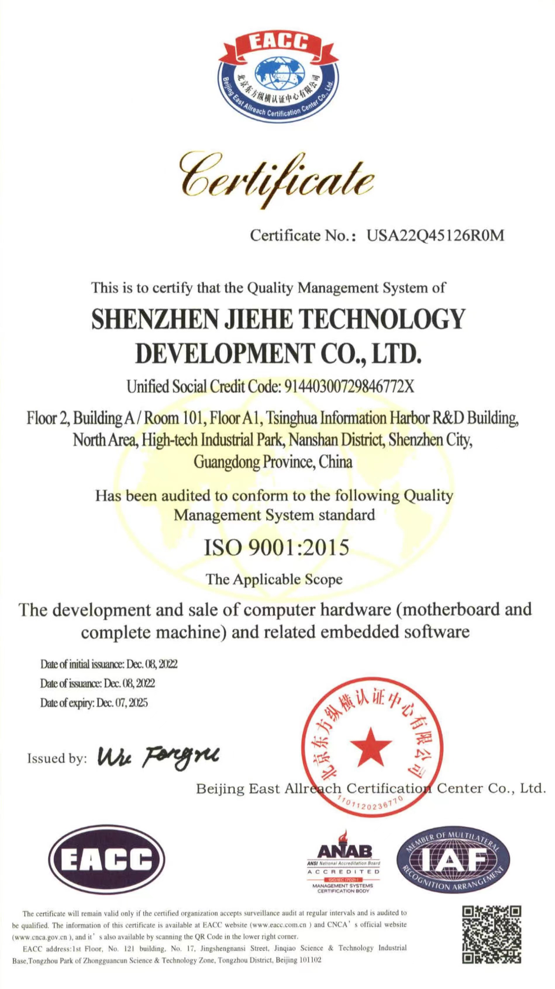 ISO9001质量管理体系认证作为国际标准化组织的管理性质标杆,它的地位可见一斑,其认可彰显了k8.com科技的体系管理以及产品的质量。k8.com科技在过去几年不断提升设备标准化生产的能力,减少人为质量问题,把ISO9001质量管理体系理念贯穿于产品研发—生产全流程。