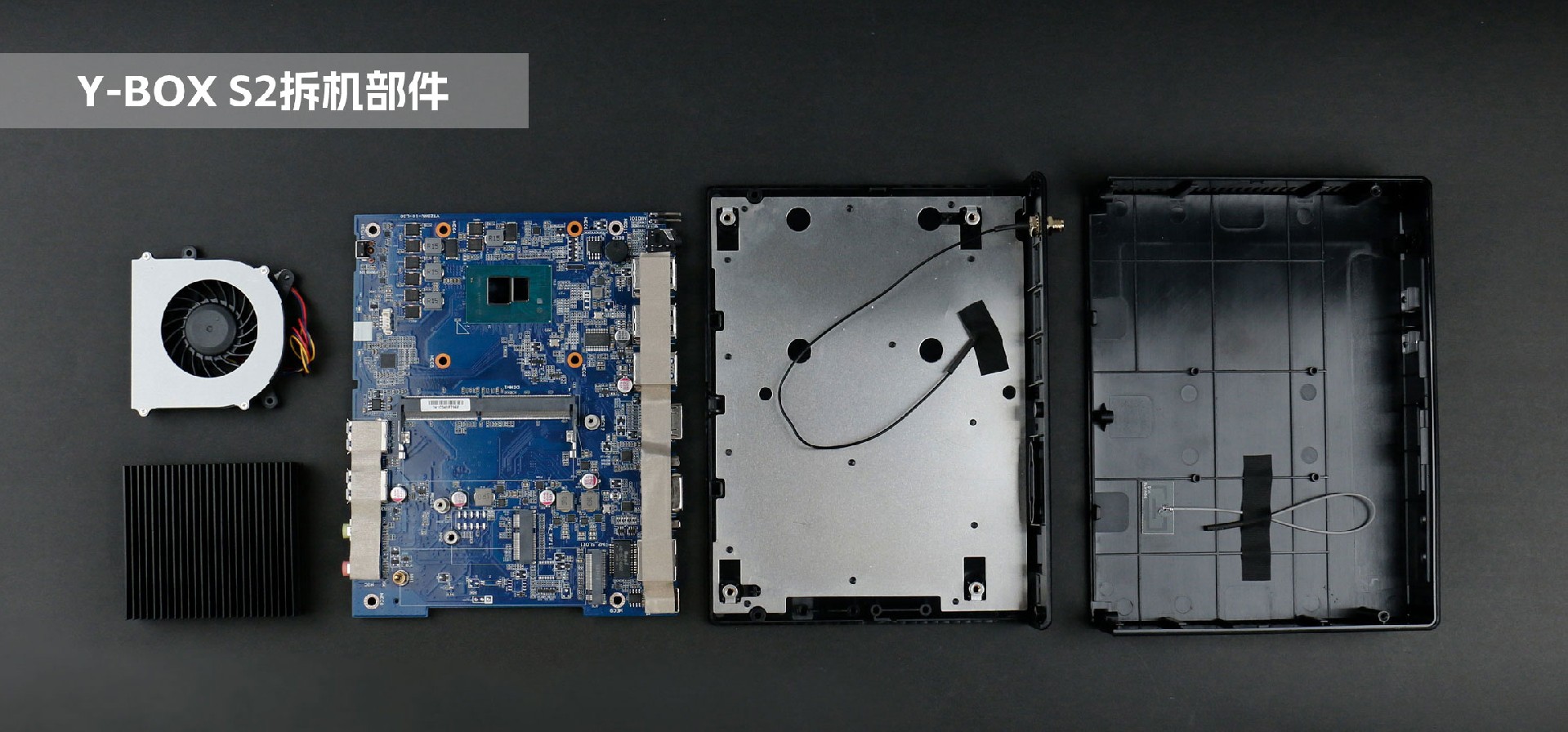 k8.com桌面云终端Y-BOX S2机壳由两片式塑胶壳组合而成,整机由上至下主要分为三个部分:顶部外壳、内部主板、底部外壳。底部外壳内附一层铝板防静电,以防主板被静电损坏。主板处理器顶部安装一体式铝板鳍片,并涂抹一层散热膏用于导热,提高散热强度。同时,主板中部安装强劲的风扇用于散热,降低内存与硬盘读取时受温度的影响,提高运行稳定性。