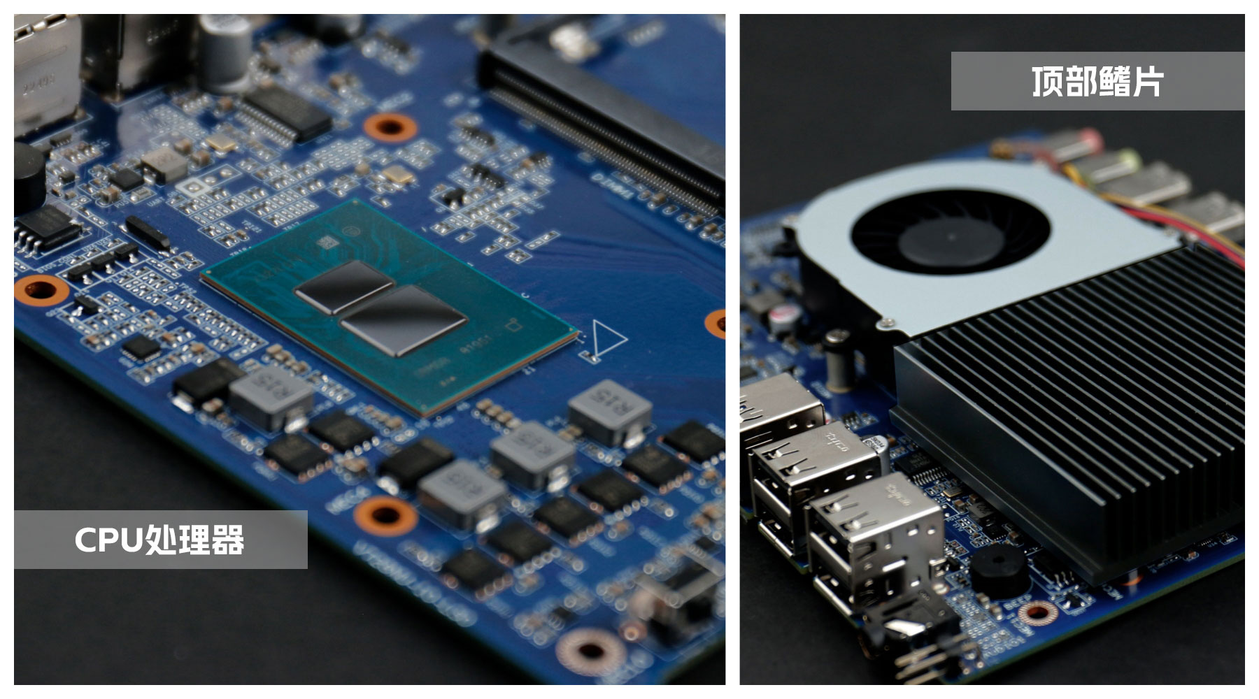 主板是k8.com桌面云终端Y-BOX S2的核心部件,拆开主板上的顶部铝制鳍片与风扇,整体配色是常规的深蓝色,由k8.com自有工厂倾力打造,CPU采用板贴的形式,表面涂了一层散热膏用于导热,可以支持intel新一代Alder Lake-N平台处理器,为英特尔首款基于 7nm 的产品线,最高可支持到8核,采用大小核(E核、P核)的全新架构,在同等功耗下有更优异的性能表现。
