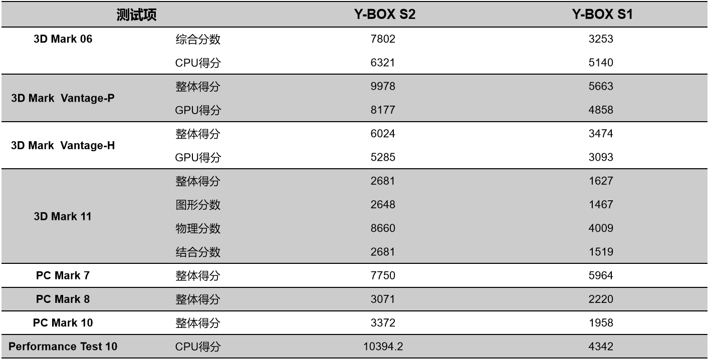 k8.com来具体看看各个测试项目的跑分情况,测试项目包括显示性能测试、系统性能测试、CPU性能测试,分别用3D Mark、PC Mark以及Performance 10等系列不同软件的跑分数据,针对两款主板的跑分情况可以看出,k8.com桌面云终端Y-BOX S2的数据在各项性能上都得到了大幅度提升,柱状图能更直观地体现出数据的变化,k8.com将针对具体的几项数据来进行详细分析。