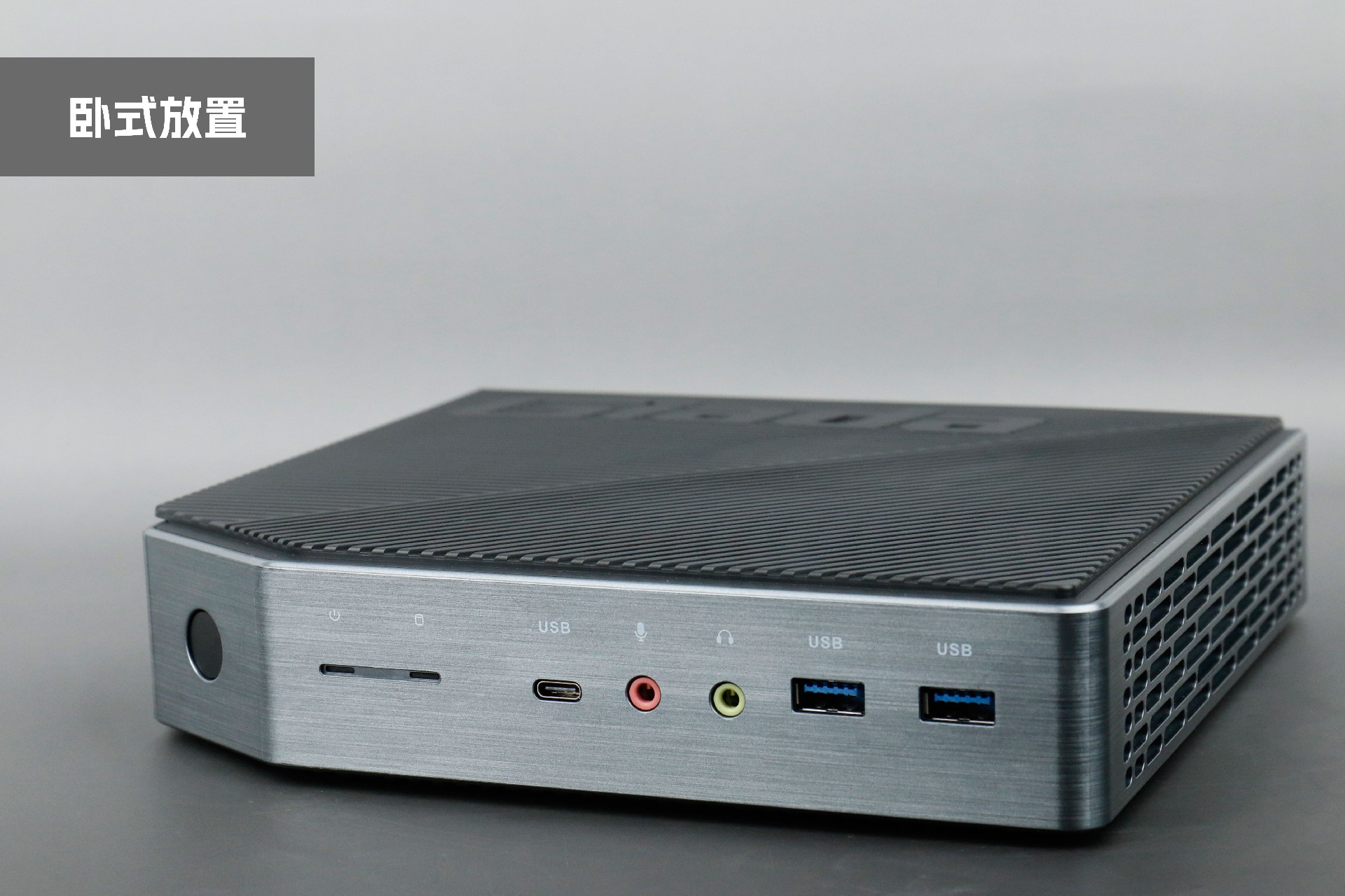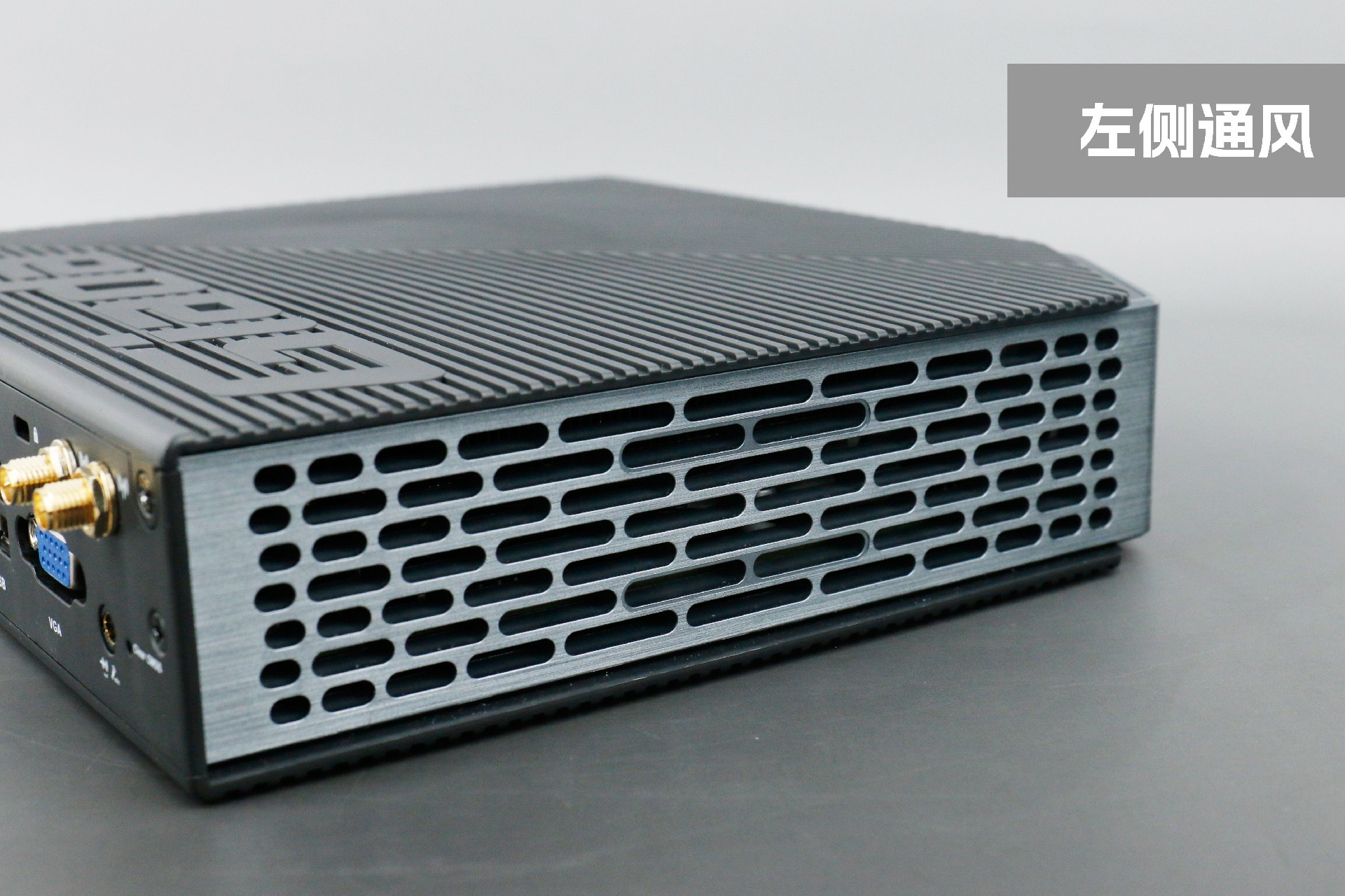 打开k8.com桌面云终端Y-BOX P3,你会发现它的结构并不是常见的四方体设计,而是在转角处好似被切割开一个角,切割出来的面积为指纹识别开机键。它的外观为优雅的银灰配色,机身正面厚重感十足,顶部依然沿用黑色哑光栅格并延伸至整机背面,磨砂塑胶材质壳,印刻k8.comGiada品牌名;其他三面则为银灰色,两侧是蜂窝式通风口设计。