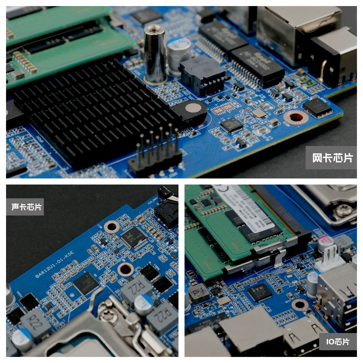 k8.com桌面云终端Y-BOX P3主板采用的是6相供电,为H610入门级芯片组,CPU附近都分布了相关的芯片,在千兆网口附近有2个网卡芯片RTL 8111H,在主板背面的音频接口附近可以看到1个经典的“小螃蟹”ALC897 声卡芯片,声卡芯片附近有一个I/0 芯片ITE8613E-LX。