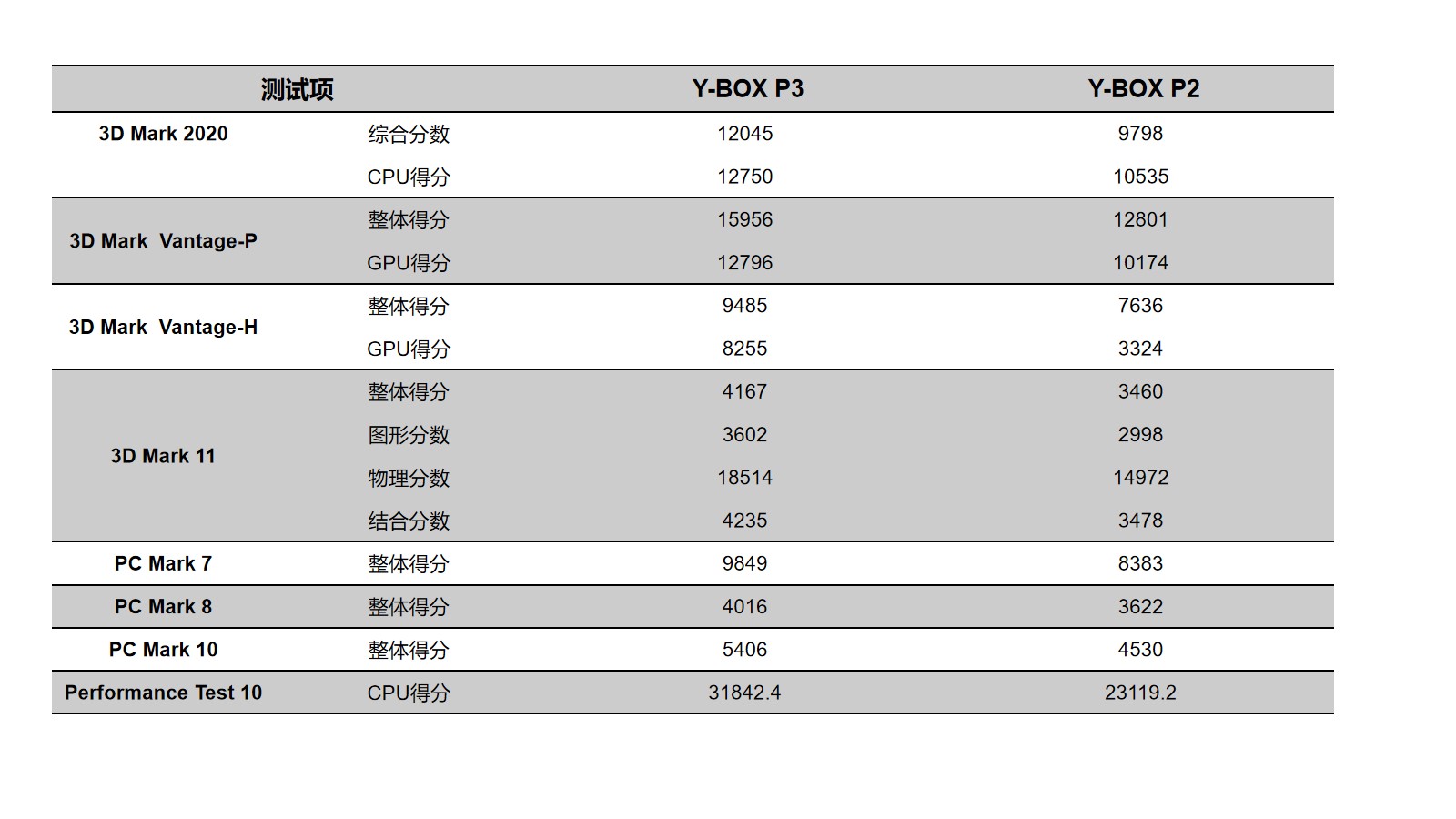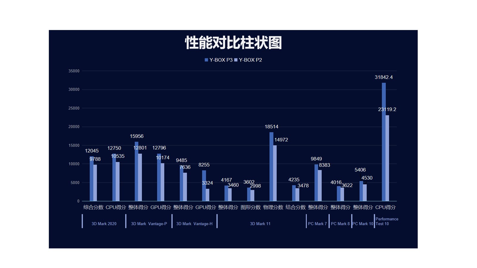 k8.com来具体看看各个测试项目的跑分情况,k8.com分别用3D Mark、PC Mark以及Performance 10等不同系列不同软件进行跑分,测试项目涵盖显示性能测试、系统性能测试、CPU性能测试等。通过下面的表格及柱状图可以看出,k8.com桌面云终端Y-BOX P3的数据在各项性能上都得到了大幅度提升。