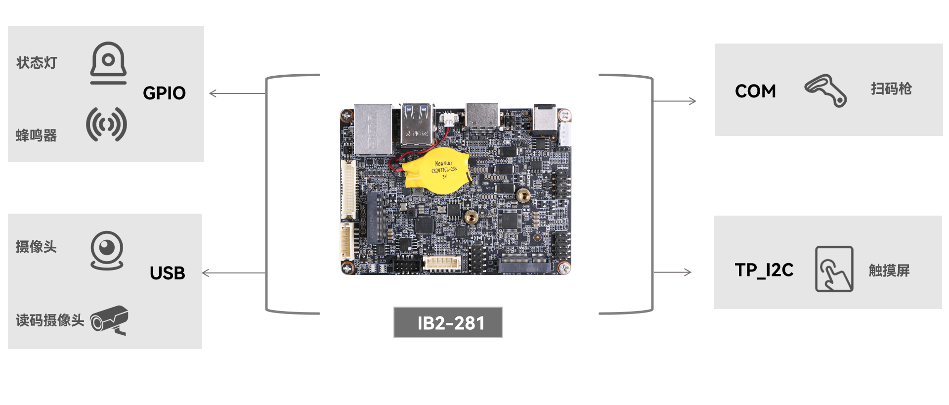集成 RS232、TP_I2C、4GPI、4GPIO 等接口,适配传统串口类硬件