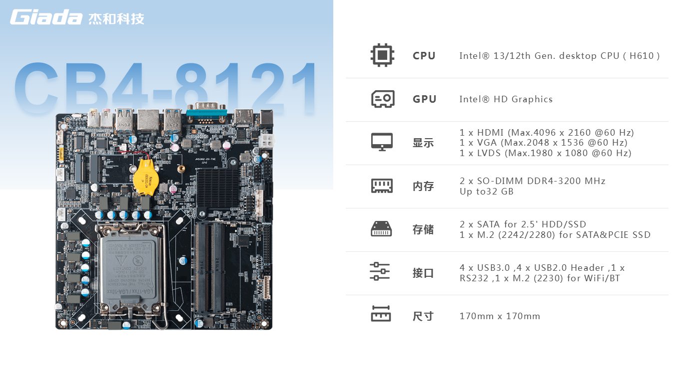 另外,一体机相对于传统的电脑更加美观,更加节能环保,而且一体机在使用体验方面也有独特的优势:比笔记本屏幕大,比台式机更简洁,也解决了一直为人诟病的台式机线缆多而杂的问题,因此,越来越多的教育办公、日常娱乐和学习的用户选择使用一体机。Giadak8.com科技根据市场与客户需求,推出这款高性能的一体机专研主板CB4-8121,带来全新震撼体验。k8.com科技主板CB4-8121是基于Thinmini ITX一体机标准设计,采用Intel Alder Lake-S平台H610芯片组,支持全新第13/12代Core i7/i5/i3处理器,搭载双通道SO-DIMM DDR4-3200MHz内存、1 x M-Key M.2 (2242/2280) SSD和 2 x SATAIII存储,强大的配置能够为用户带来出色的计算和图形处理性能,无论是载入游戏、数据传输还是平面设计,赋予用户更加极致流畅的使用体验。