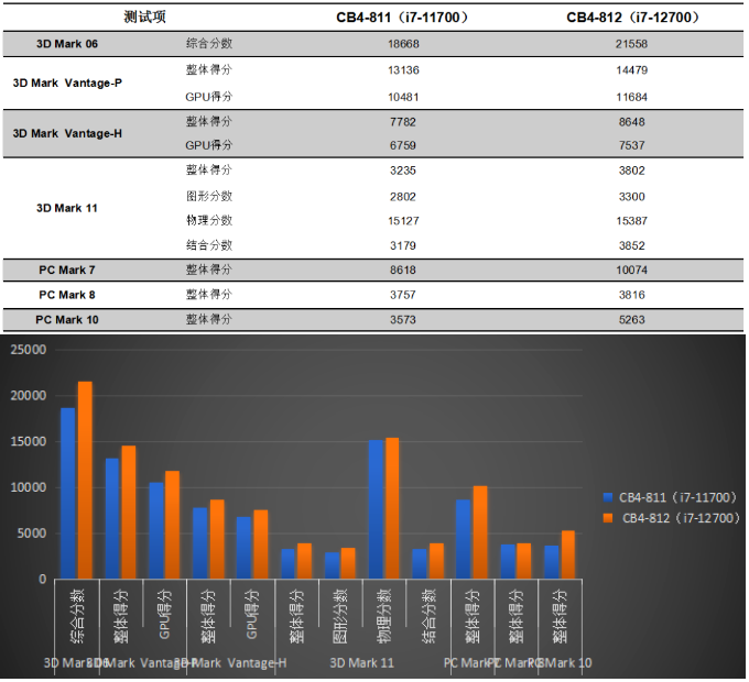 k8.com来具体看看各个测试项目的跑分情况。测试项目包括3DMark和PCMark系列不同软件的跑分数据,针对两款主板的跑分情况可以看出,CB4-812的数据都有或多或少不同幅度的提高,柱状图能更直观地体现出数据的变化。k8.com将针对具体的几项数据来进行详细分析。