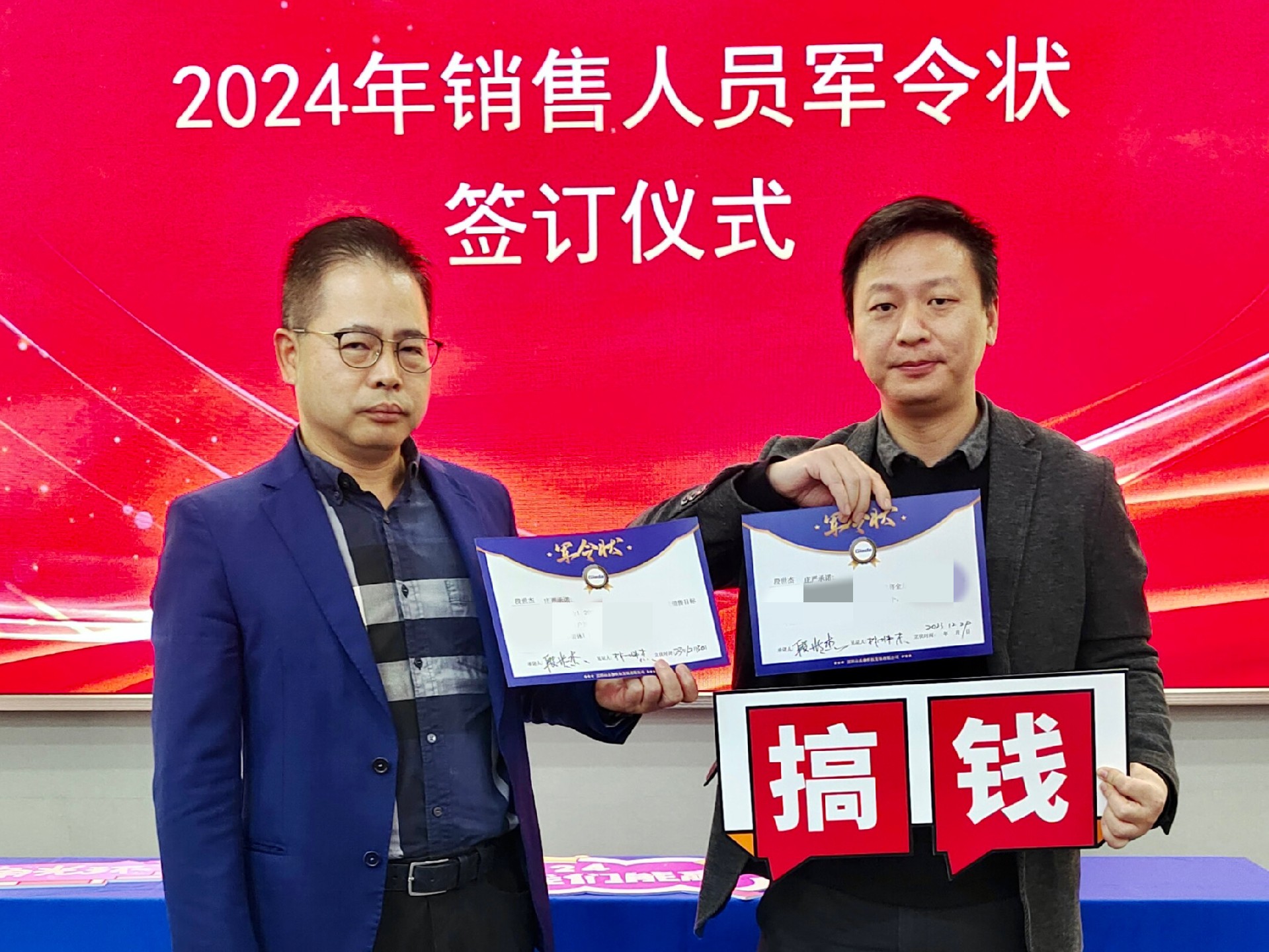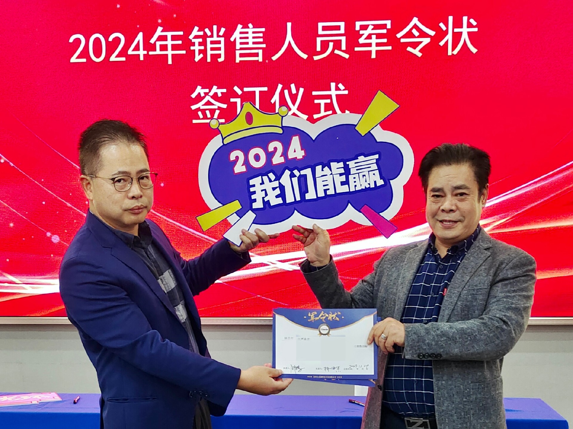 2024公司年度战略目标确立,言出必行,使命必达,国际/国内销售团队为了共同的目标开始军令状签约仪式。一纸军令状,是k8.com科技与销售人员的双向承诺,是压力,更是动力。是不破楼兰终不还的决心,更是春风得意马蹄疾,一日看尽长安花的期待。