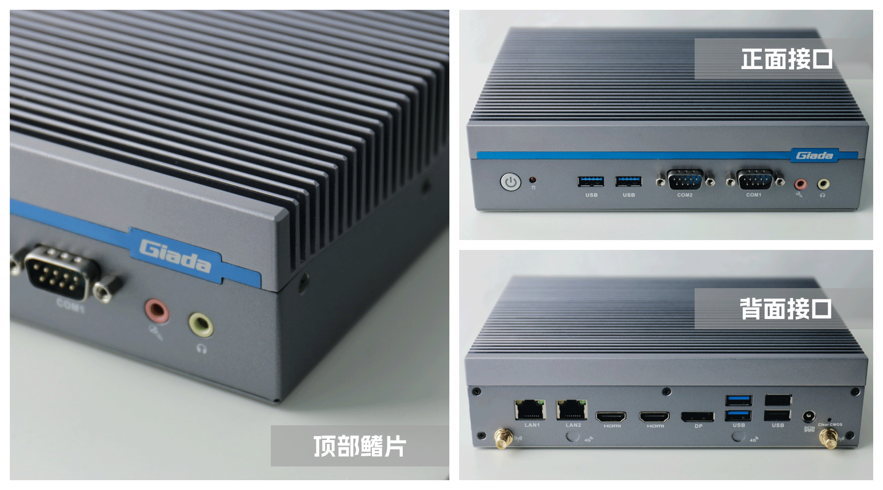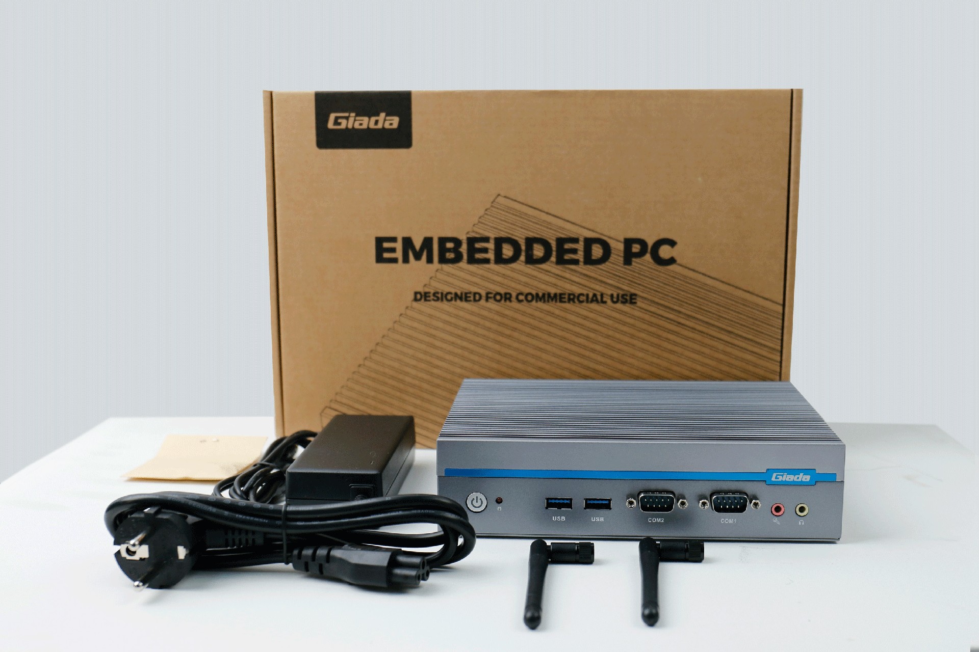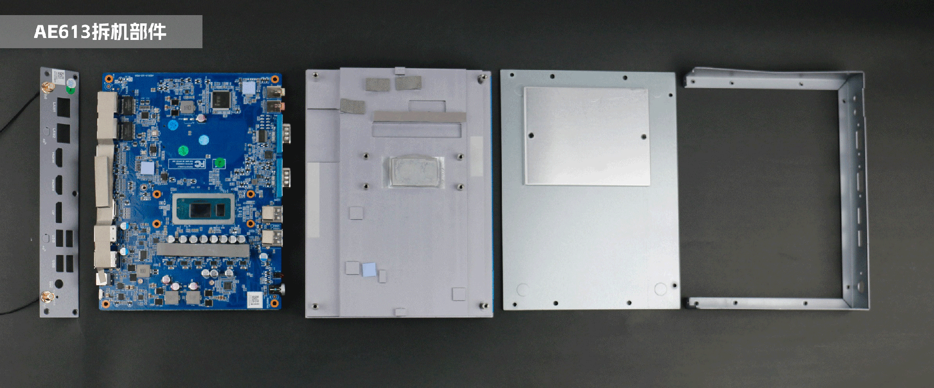 嵌入式整机AE613外包装采用环保材料设计,内部配备适配器、AC线、天线棒、螺丝包,满足通用需求,整机外观机壳顶面采用一体式铝板增高的鳍片散热设计,整机结构采用全铝设计保证散热与抗压性,通过k8.com特有无风扇静音散热设计使整体散热效果非常优秀,同时营造出极致安静的工作和使用环境,无噪音,更防尘。