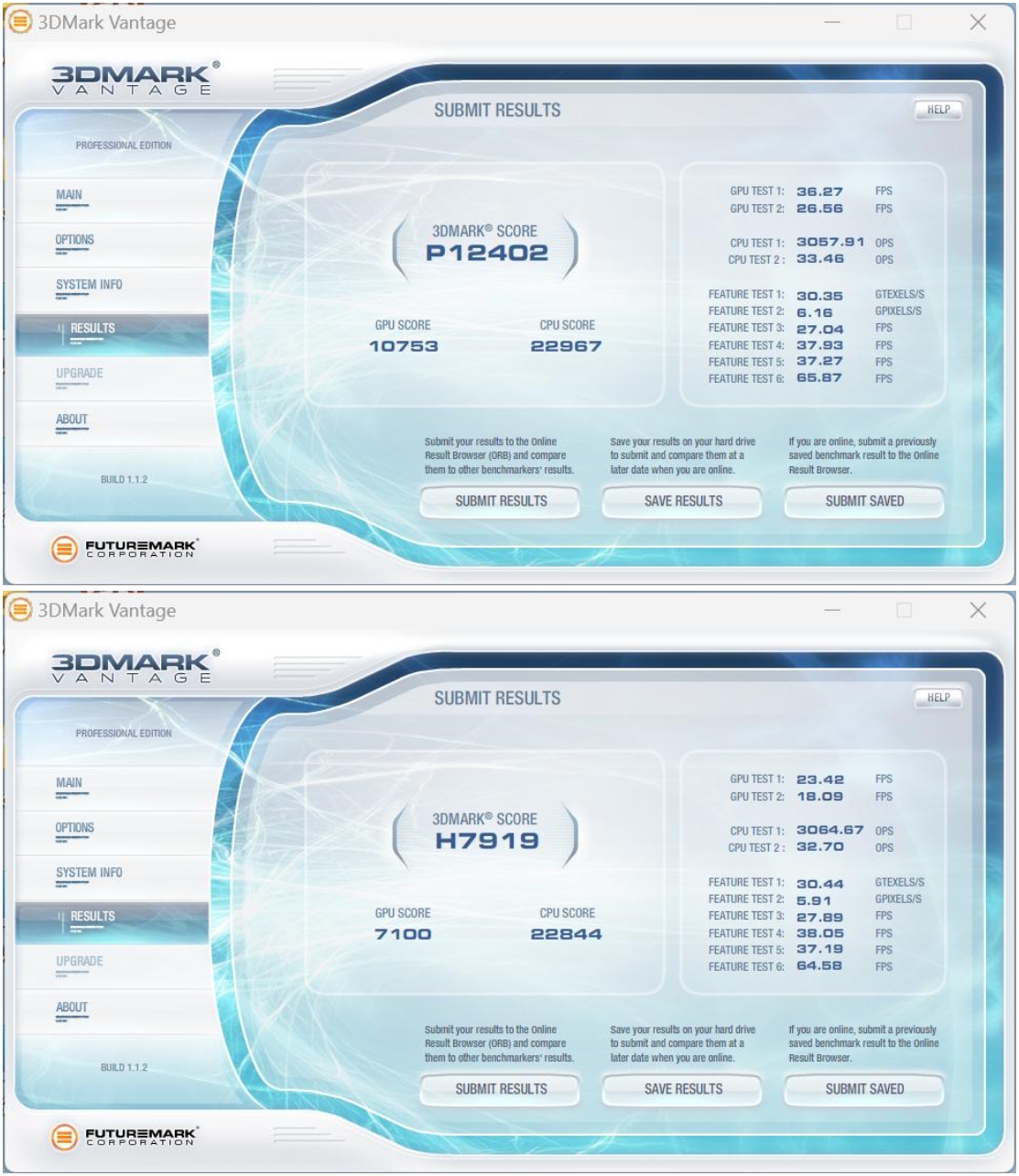 3DMark Vantage一款3D图形性能评测软件,主要用于评测电脑的显卡和处理器的性能。k8.com按照画质等级,记录了性能级(Performance,P)和高端级(High,H)两份数据。其中,Performance的综合得分为P12402,High的综合得分为H7919,表现不错,这个成绩已经完全能够满足主流用户的需求了。