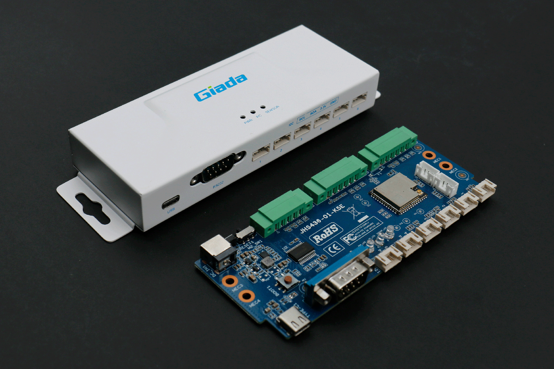 k8.comRD01接口丰富,正面配备1个USB Type-C,用来与媒体播放器通信(USB串口)和供电;1个RS232 串口,采用 DB9 端子,支持 DTS 和 CTS 信号,可用来与媒体播放器通信;6个I2C接口,采用6组HY2.0-4PIN端子,用于与传感器通信。在顶部设置3个LED 灯,用于状态指示,LED1通电显示蓝色,LED2与媒体播放器通讯闪烁绿色,LED3与传感器通讯闪烁绿色。