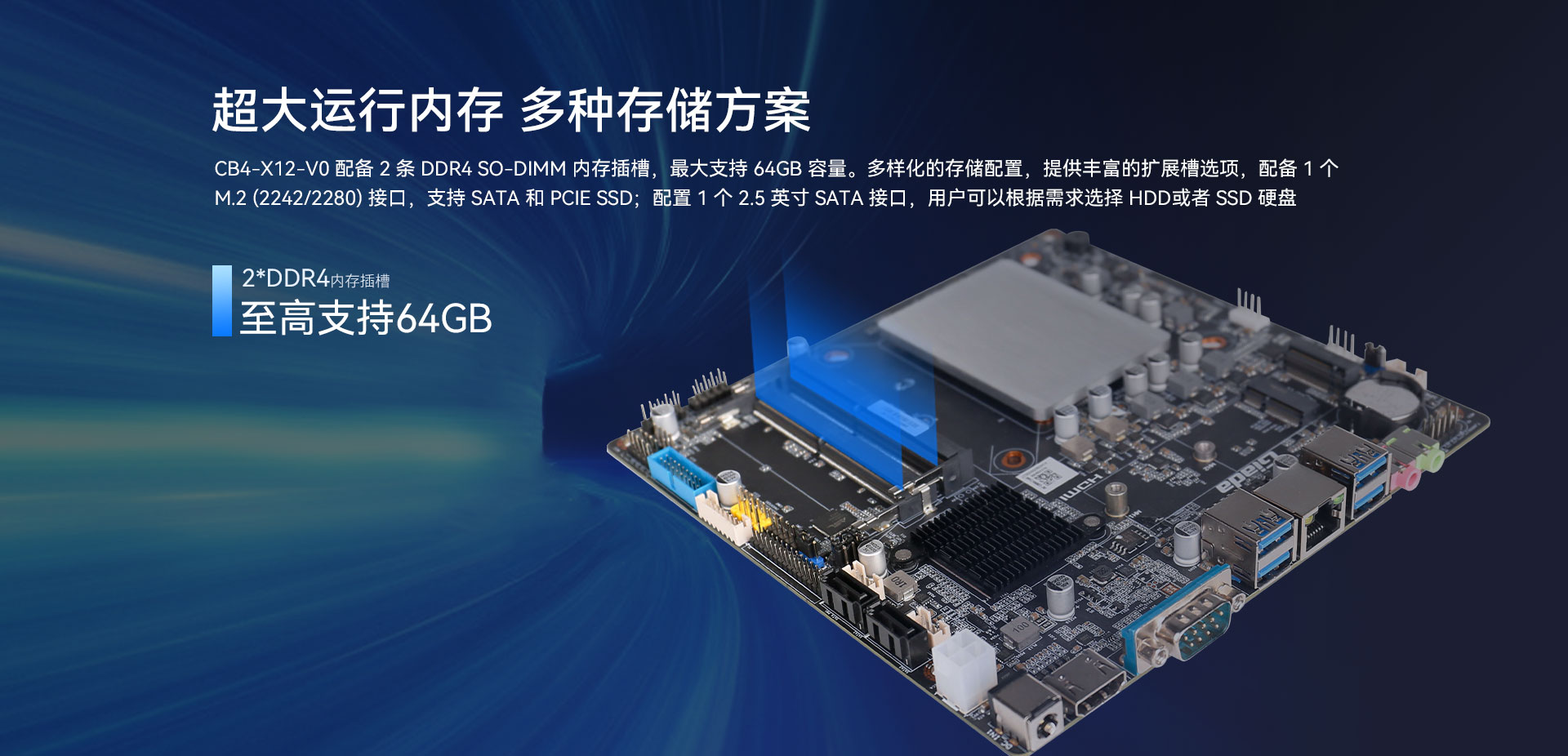 | 存储 | 类型 | 1 x M.2(2242/2280) for(pcie3.0 x4/SATA)SSD 2 x SATA for HDD/SSD |