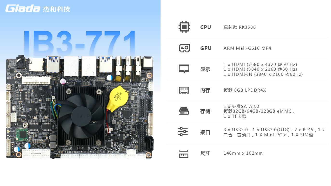 k8.com主板IB3-771内置瑞芯微新一代旗舰级高端芯片RK3588,6TOPS算力的NPU,具有高算力、内存大、超强多媒体、多重扩展等技术优势。支持主流深度学习框架,能够为各类养老 AIOT 应用场景提供更优的性能表现。